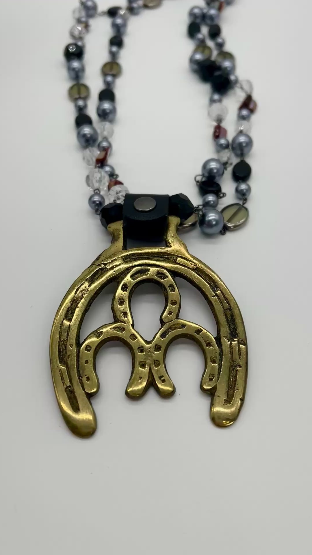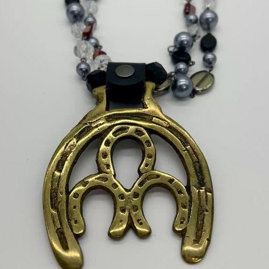 Vintage Horse Brass Medallion Necklace – Double Horseshoe Pendant on Dark Multi-Strand Beads